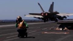 A man kneels down on the deck of aircraft carrier USS Gerald R Ford as a fighter plane is seen behind him (09/03/26)