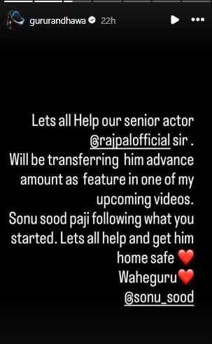 गुरु रंधावा ने अपने इंस्टाग्राम स्टोरी पर राजपाल यादव की मदद की बात कही है। सिंगर ने लिखा है, चालों सभी अपने सीनियर एक्टर राजपाल यादव की मदद करते हैं। अपने आने वाले म्यूजिक वीडियो में एक्टर को कास्ट करने के लिए मैं उन्हें एडवांस पैसे भेज रहा हूं। सोनू सूद पाजी मैं वो फॉलो कर रहा हूं जो अपने शुरू किया है। मदद करते हुए उन्हें सुरक्षित घर लाते हैं’।