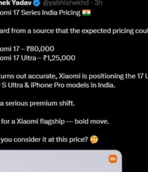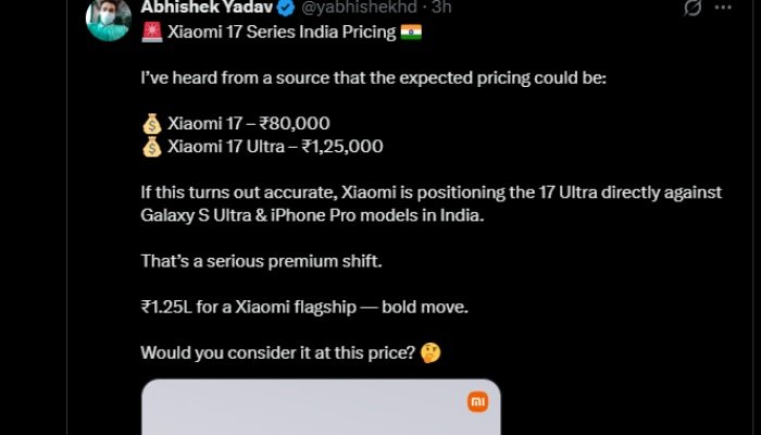 टिप्स्टर अभिषेक यादव (@yabhishekhd) के एक एक्स पोस्ट में किए गए नए दावे के मुताबिक, टिप्स्टर ने कहा कि स्टैंडर्ड Xiaomi 17 की कीमत लगभग 80,000 रुपये हो सकती है, जबकि Xiaomi 17 Ultra लगभग 1,25,000 रुपये में लॉन्च हो सकता है। ये कीमतें अपने पहले के मॉडल्स की तुलना में काफी ज्यादा हैं, जिन्हें क्रमशः 64,999 रुपये और 1,09,999 रुपये में लॉन्च किया गया था।