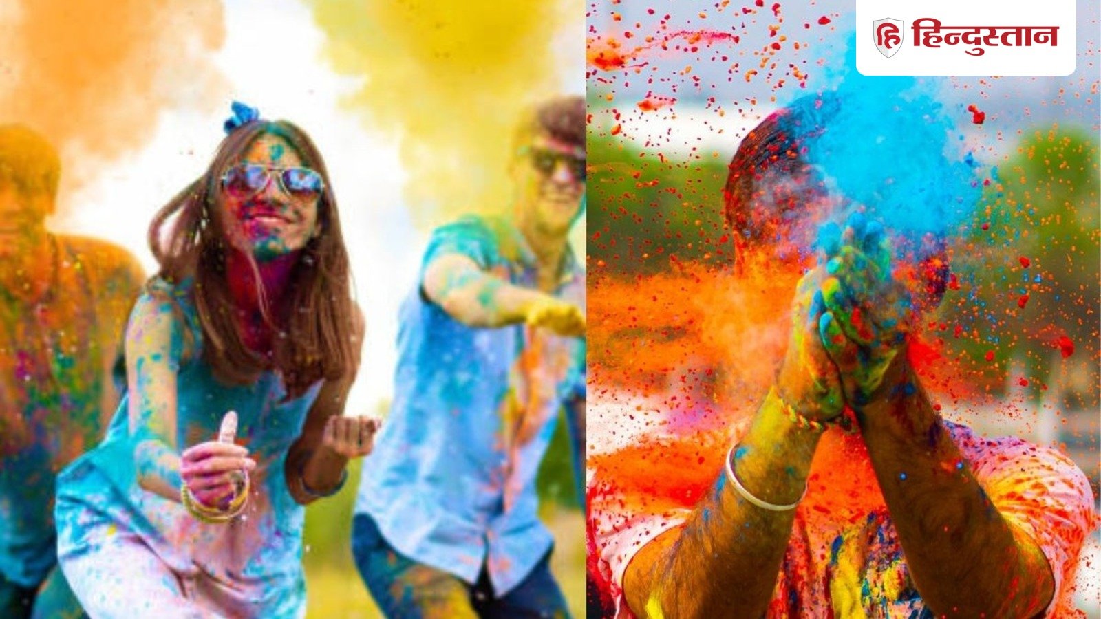 होली खेलते हुए एक कपल जो हाथ पकड़े हुए है, चारों ओर रंगों की बौछार हो रही है, उत्सव का माहौल है, खुशनुमा वातावरण है, त्वचा का रंग बिल्कुल असली जैसा है। एक 4K फोटो तैयार करें।