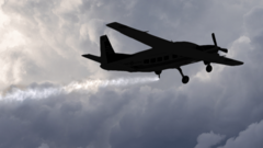 একটি ছোট বিমানের ছায়ামূর্তি দেখা যাচ্ছে, যা আকাশে ছোট ছোট কণা ছিটাচ্ছে এবং তার পেছনে দীর্ঘ সাদা রেখা তৈরি হচ্ছে। বিমানের পেছনে ঘন, ধূসর মেঘ।