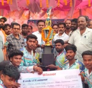 ଭଦ୍ରକ, ୫ା୪ (ଓଡ଼ିଆ ପୁଅ / ସ୍ନିଗ୍ଧା ରାୟ) – ଭଦ୍ରକ ଜିଲ୍ଲା ଚାନ୍ଦବାଲି ବ୍ଲକ ଅନ୍ତର୍ଗତ ନାଲଗୋଣ୍ଡା ଗ୍ରାମ ପଞ୍ଚାୟତ ରାମପୁର ବିଣାପାଣି ଯୁବ ପରିଷଦ, ରାମପୁର ଦ୍ୱାରା ଆୟୋଜିତ କ୍ରିକେଟ ଟୁର୍ଣ୍ଣାମେଣ୍ଟ ଉତ୍ସାହ ଓ ମହାଆଡମ୍ବର ମଧ୍ୟରେ ସଫଳତାର ସହ ଉଦ୍ଜାପିତ ହୋଇଯାଇଛି। ଏହି ଟୁର୍ଣ୍ଣାମେଣ୍ଟରେ ପାଖପାଖି ଅଞ୍ଚଳର ବହୁ କ୍ରିକେଟ ଦଳ ଅଂଶଗ୍ରହଣ କରି ଖେଳକୁ ରୋମାଞ୍ଚକର କରିଥିଲେ।ଅନ୍ତିମ ମ୍ୟାଚ୍‌?ରେ ଦୁଇଟି ଶକ୍ତିଶାଳୀ ଦଳ ବାବା ସଦାଶିବ ନୂଆବନ୍ଧ କ୍ରିକେଟ ଦଳ ଓ ବାବା ମଣି ନାଗେଶ୍ୱର ତେନ୍ତୁଲି ଡିହ ମଧ୍ୟରେ ମୁହାଁମୁହିଁ ହୋଇ ଦର୍ଶକମାନଙ୍କୁ ରୋମାଞ୍ଚିତ କରିଥିଲେ। ଶେଷରେ ବିଜୟୀ ଦଳକୁ ଟ୍ରଫି ଓ ପୁରସ୍କାର ପ୍ରଦାନ କରାଯାଇଥିଲା। ଏହି ଅବସରରେ ମୁଖ୍ୟ ଅତିଥି ଭାବେ ଏକ ନମ୍ବର ଜୋନ୍ ର ଜିଲ୍ଲା ପରିଷଦ ପ୍ରିନ୍ସରାକେଶ ନାୟକ,ଖେରଙ୍ଗ ଗ୍ରାମ ପଞ୍ଚାୟତ ର ସରପଞ୍ଚ ଜିତେନ୍ଦ୍ର ବିଶ୍ୱାଳ, ପୂର୍ବତନ ସମବାୟ ସମିତି ର ସଭାପତି ପ୍ରଭାତ ନାୟକ ଙ୍କ ସମେତ ସ୍ଥାନୀୟ ନେତୃବୃନ୍ଦ ମାନେ ଉପସ୍ଥିତ ଥିଲେ। ଯୁବକମାନେ ଓ କ୍ରିକେଟ ପ୍ରେମୀମାନେ ବିପୁଳ ସଂଖ୍ୟାରେ ଉପସ୍ଥିତ ଥିଲେ।ଆୟୋଜକମାନଙ୍କ କହିବା ଅନୁଯାୟୀ, ଏହି ପ୍ରତିଯୋଗିତାର ଲକ୍ଷ୍ୟ ଯୁବ ପିଢିକୁ କ୍ରିଡାରେ ଆଗ୍ରହୀ କରିବା ସହ ତାଙ୍କ ମଧ୍ୟରେ ଭାଇଚାରା ଓ ଏକତା ବୃଦ୍ଧି କରିବା। କାର୍ଯ୍ୟକ୍ରମ ଟି ସଫଳ ଭାବେ ସମାପ୍ତ ହୋଇଥିବାରୁ ସ୍ଥାନୀୟ ଅଞ୍ଚଳରେ ଆନନ୍ଦର ମାହୋଲ ସୃଷ୍ଟି ହୋଇଛି। ଉକ୍ତ କ୍ରିକେଟ ପ୍ରତିଯୋଗିତା ରେ ବାବା ସଦାଶିବ ନୂଆବନ୍ଧ କ୍ରିକେଟ ଟିମ୍ ୨୦ ଓଭର ରେ ୧୨୫ ରନ୍ କରିଥିବା ବେଳେ ବାବା ମଣି ନାଗେଶ୍ୱର ତେନ୍ତୁଳି ଡିହ ୨୦ ଓଭର ରେ ୧୩୧ କରି ବିଜେତା ହୋଇଥିଲା।ବିଜେତା ହାସଲ କରିଥିବା ଦଳକୁ ଟ୍ରଫି ସହିତ ୧୦୦୦୦ ହଜାର ଟଙ୍କା ମିଳିଥିବା ବେଳେ ରନରସ୍ପ ୭୦୦୦ ହଜାର ଟଙ୍କା ମିଳିଥିବା ସୂଚନା ମିଳିଛି। ବିଣାପାଣି ଯୁବ ପରିଷଦ ର ଅନିଲ ଦାସ, ଶିବଶଙ୍କର ଦାସ, ଶିଶିର ଦାସ, ମନୋରଞ୍ଜନ ଦାସ,କୁନୁ ଦାସ,ଗୈତମ ଦାସ, ସୁନିଲ ଦାସ ଉପସ୍ଥିତ ଥିଲେ।