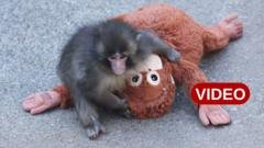 తల్లితో పాటు మిగతా కోతులు ఈ కోతి పిల్లను దగ్గరకు రానివ్వ లేదు. దీంతో ఇది ఒరంగుటాన్ బొమ్మతో ఆడుకుంటోంది.