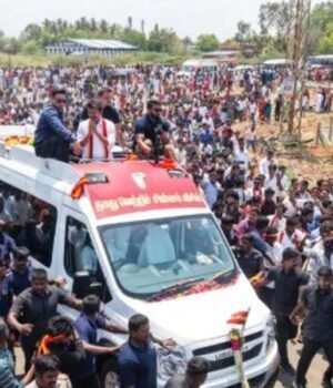 പ്രചാരണത്തിന്റെ ഭാഗമായി മഹാദാനപുരത്ത് എത്തിയ വിജയിയെ കാണാന് വലിയ ജനക്കൂട്ടമാണ് എത്തിയതും ആവേശം പ്രകടമാക്കിയതും. നിലവിലെ സര്ക്കാരിനെ വിമര്ശിച്ച അദ്ദേഹം, തിരഞ്ഞെടുപ്പിനോടനുബന്ധിച്ച് ടി വി കെ അവതരിപ്പിക്കുന്ന വാഗ്ദാനങ്ങളും ജനങ്ങള്ക്ക് മുന്നില് വിശദീകരിച്ചു.