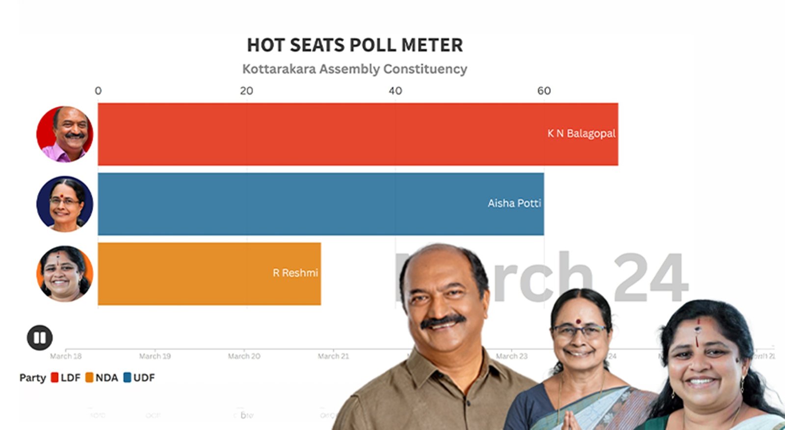 കേരളം ഉറ്റുനോക്കുന്ന തെരെഞ്ഞെടുപ്പാണ് കൊട്ടാരക്കര മണ്ഡലത്തിൽ നടക്കുന്നത്. ഇടതുപക്ഷത്തെ അതികായനായ ധനകാര്യമന്ത്രി കെ എൻ ബാലഗോപാൽ മത്സരിക്കുന്ന മണ്ഡലം എന്നതുമാത്രമല്ല കൊട്ടാരക്കരയെ മാധ്യമശ്രദ്ധയിലെത്തിക്കുന്നത്. പതിനഞ്ച് വർഷം കൊട്ടാരക്കരയിൽ ഇടതുപക്ഷ എം എൽ എ ആയിരുന്ന അയിഷാ പോറ്റി യു ഡി എഫ് സ്ഥാനാർത്ഥിയായി മത്സരിക്കുന്ന മണ്ഡലം എന്നതു കൂടിയാണ്.