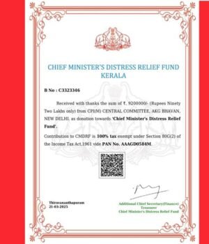 സി എം ഡി ആര്‍ എഫിലേക്ക് പണം കൈമാറിയതിന്റെ റെസീപ്റ്റും പുറത്തുവിട്ടിട്ടുണ്ട്. വയനാട് ഉരുള്‍പൊട്ടല്‍ ദുരന്തത്തിന്റെ പശ്ചാത്തലത്തില്‍ സി പി എം കേന്ദ്ര കമ്മിറ്റി രൂപീകരിച്ച പ്രത്യേക ഫണ്ടിലേക്ക് ലഭിച്ച തുക പൂര്‍ണ്ണമായും മുഖ്യമന്ത്രിയുടെ ദുരിതാശ്വാസ നിധിയിലേക്ക് കൈമാറിയിട്ടുണ്ടെന്ന് സി പി എം ജനറല്‍ സെക്രട്ടറി എം എ ബേബി വ്യക്തമാക്കി.