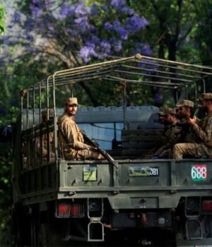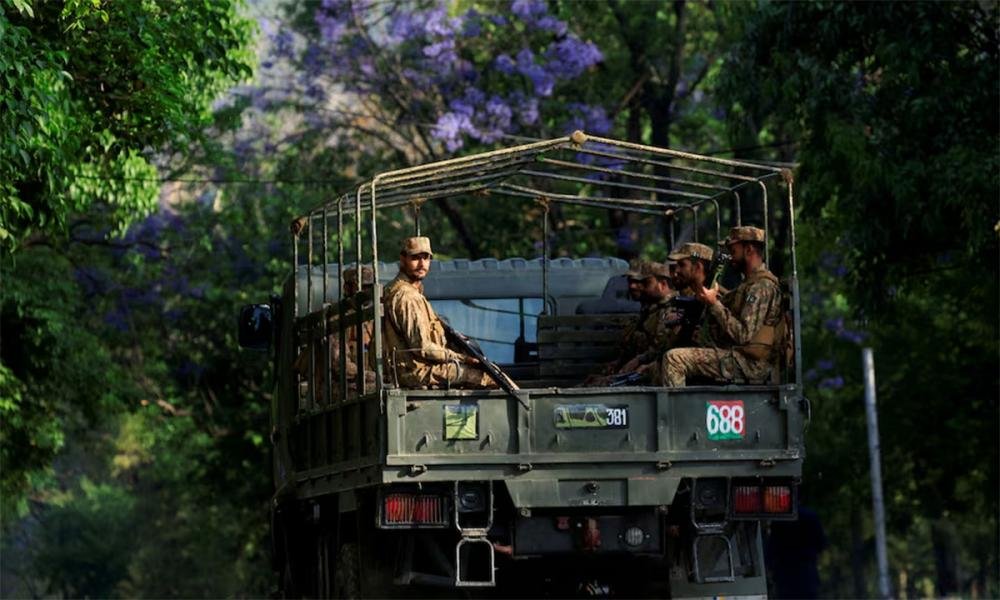 ഇസ്ലാമാബായിൽ രണ്ടാം ഘട്ട സമാധാന ചർച്ചകൾക്കായി ആതിഥേയത്വം വഹിക്കാൻ പാകിസ്ഥാൻ ഒരുങ്ങുമ്പോൾ, പ്രസിഡന്റിന്റെ ഭവനത്തിനടുത്തുള്ള ഡി ചൗക്കിൽ പാകിസ്ഥാൻ സൈനികർ പട്രോളിംഗ് നടത്തുന്നു.