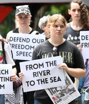 Bonnie Carter protested new state regulations that outlaw the phrase “from the valley to the sea” at a rally held on Wednesday outside Queensland Parliament.