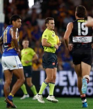 Nasiah Wanganeen-Milera missed his shot for goal midway through the quarter and the goal umpire paid a behind despite Marshall claiming he had taken the mark. The umpires didn’t call for a score review and West Coast played on after the score.