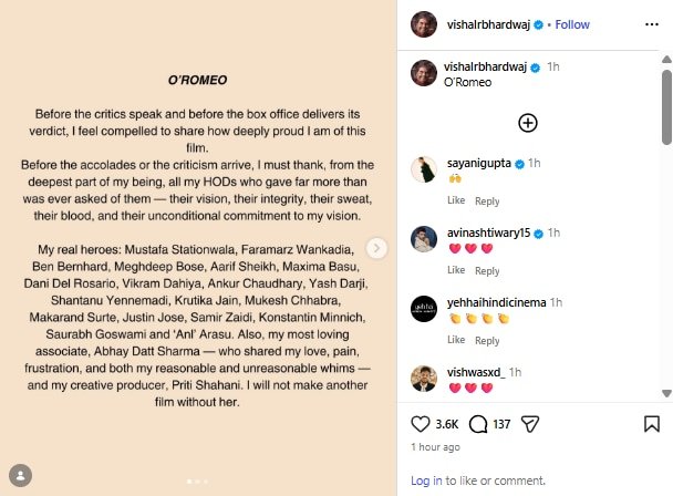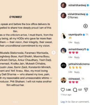 On the eve of the theatrical release of O’Romeo, director Vishal Bhardwaj shared an emotional and reflective note. He penned his thoughts on the journey of the film before it meets critics or audiences.