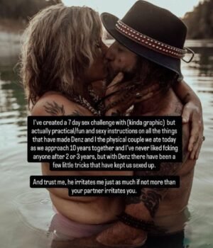 “I’ve created a 7 day sex challenge with (kinda graphic) but actually practical/fun and sexy instructions on all things that have made Denz and I the physical couple we are today as we approach 10 years together and I’ve never liked f****** anyone after 2 or 3 years, but with Denz there have been a few little tricks that have kept us sexed up,” the mother wrote.