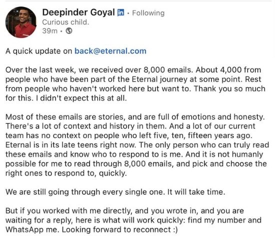 For former colleagues awaiting a response, Goyal offered a quicker route to reconnect: “But if you worked with me directly, and you wrote in, and you are waiting for a reply, here is what will work quickly: find my number and WhatsApp me. Looking forward to reconnect.”