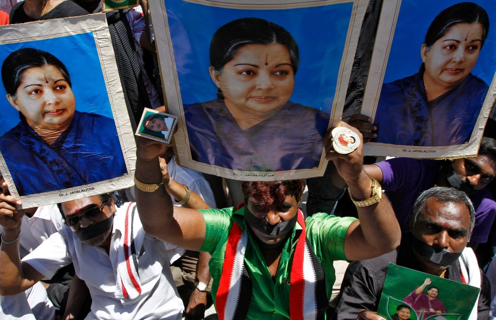 Supporters of Jayalalithaa hold her posters as they sit on a fast during a protest against the court verdict in Chennai. (Reuters)
