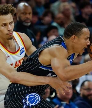 With 7:30 remaining in the game and the Hawks up 110-89, Magic centre Goga Bitadze drew a flagrant foul 2 (and automatic ejection) for pulling Landale down by the shoulder.