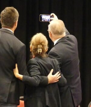 The pair entered the event together to a standing ovation from supporters, shook hands and took a selfie with Lismore MP Janelle Saffin.