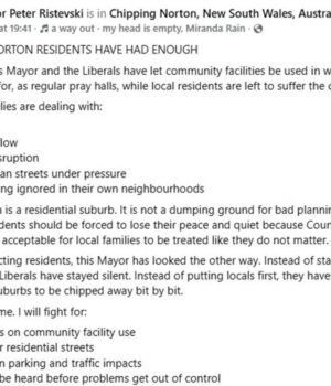 “Chipping Norton is a residential suburb. It is not a dumping ground for bad planning. It is not a place where residents should be forced to lose their peace and quiet because Council refuses to act. And it is not acceptable for local families to be treated like they do not matter.”