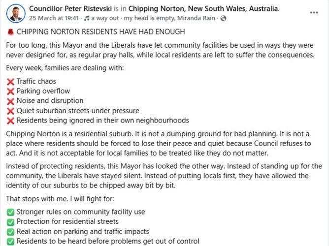 “For too long, this mayor and the Liberals have let community facilities be used in ways they were never designed for, as regular pray halls, while local residents are left to suffer the consequences,” Mr Ristevski said.