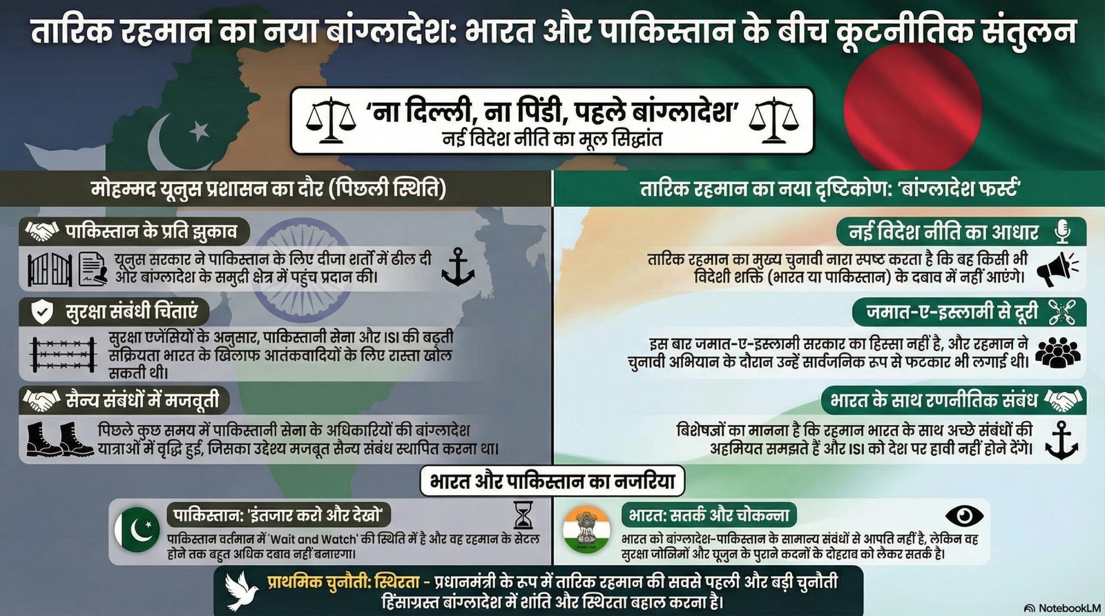 हालांकि अपने चुनावी अभियान के दौरान तारिक रहमान लगातार ‘बांग्लादेश फर्स्ट’ की बात करते रहे हैं। हालांकि बीएनपी ने कभी भी अपनी इस्लामी जड़ों से दूरी नहीं बनाई। लेकिन जिस तरह का रुख तारिक रहमान ने अभी तक दिखाया है, उसे भारत के पक्ष में अच्छा संकेत माना जा रहा है। यह स्पष्ट है कि बांग्लादेश को लेकर वह किसी भी देश के दबाव में नहीं आने वाले है। चुनाव अभियान के दौरान उनका नारा भी था, ‘ना दिल्ली, ना पिंडी, पहले बांग्लादेश’। इससे भी स्पष्ट है कि वह पाकिस्तान को भी बहुत ज्यादा हावी नहीं होने देंगे। तारिक रहमान ने चुनावी अभियान के दौरान पाकिस्तान समर्थित जमात को भी फटकार लगाई थी।
