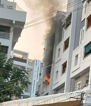 The incident occurred at Riddhi Grandeur Apartment in Manikonda, Rangareddy. The blaze started at around 6:20 pm in one of the flats on the third floor.