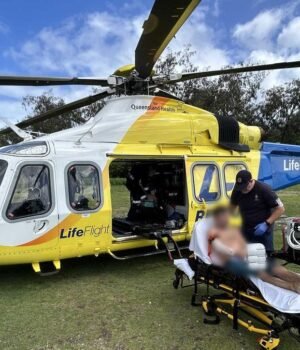 He was treated for a deep laceration to an arm and superficial wounds to his abdomen and flown to Bundaberg hospital in a stable condition.