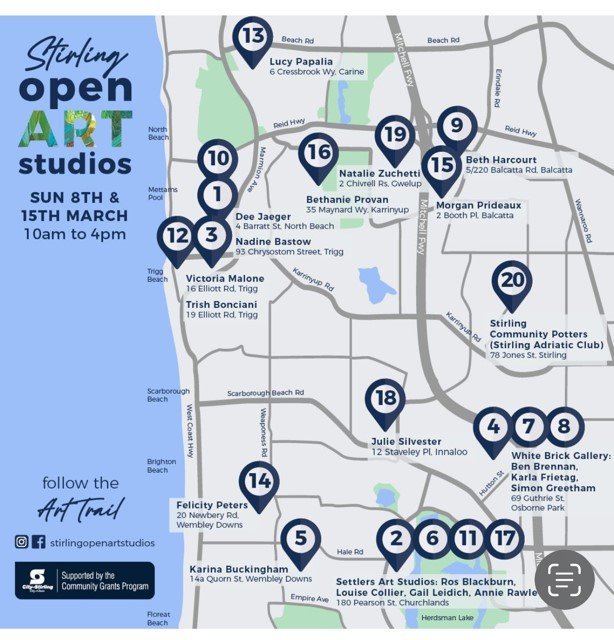 This year’s event will run on two consecutive Sundays, March 8 and 15, from 10am-4pm, with studios open across the city of Stirling, from Carine in the north to Churchlands in the south.
