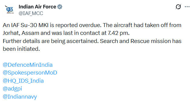 “An IAF Su-30 MKI is reported overdue. The aircraft had taken off from Jorhat, Assam and was last in contact at 7.42 pm. Further details are being ascertained. A search and Rescue mission has been initiated,” the Indian Air Force wrote on X, sharing an update of the lost fighter jet.