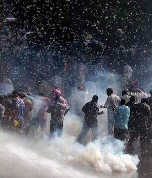Police use teargas and water cannons to disperse protestors in Chandigarh, Punjab. (Photo: Reuters)