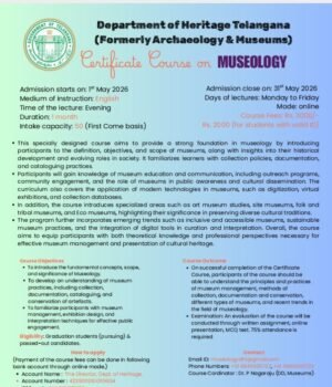 Hyderabad: The Department of Heritage Telangana is offering month-long online certificate courses on Museology and Archaeology, designed to introduce foundational and practical knowledge in: