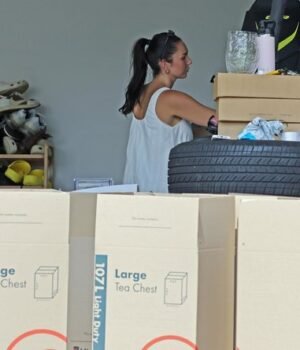 With boxes spread out across her garage, the Brisbane local appeared downcast as she sorted through belongings and cleared out her garage that she shares with husband Ben Crosley.