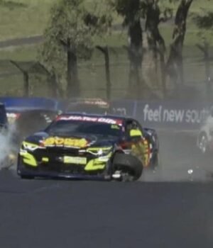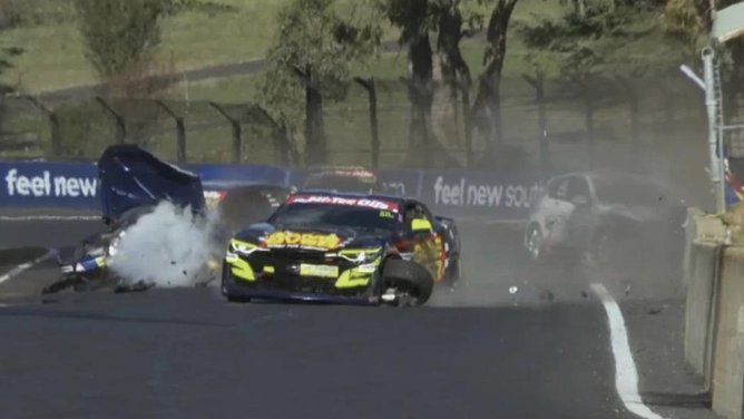 Barrum’s car then careened into a stationary Mazda driven by Matt Kiss, while Denyer’s Camaro slammed into a concrete barricade before coming to rest on the opposite side of the track.