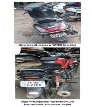 The original registration number from TS08FB2768 (Hero-Glamour) was changed to TS08FE2768 (Honda-Activa) to evade the traffic police checks and escape violations, police said.